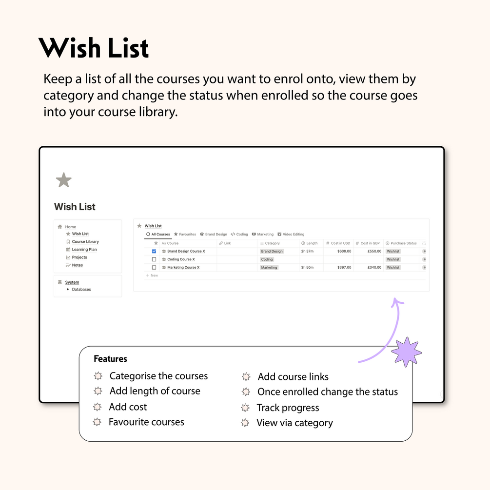 Use the Simple Self-Learning Education Planner to schedule all your online courses. Easily keep track of courses you want to purchase using the wishlist and once purchased you can move them into your course planner to schedule. Create projects, tasks and notes that relate to the course you are currently learning.
